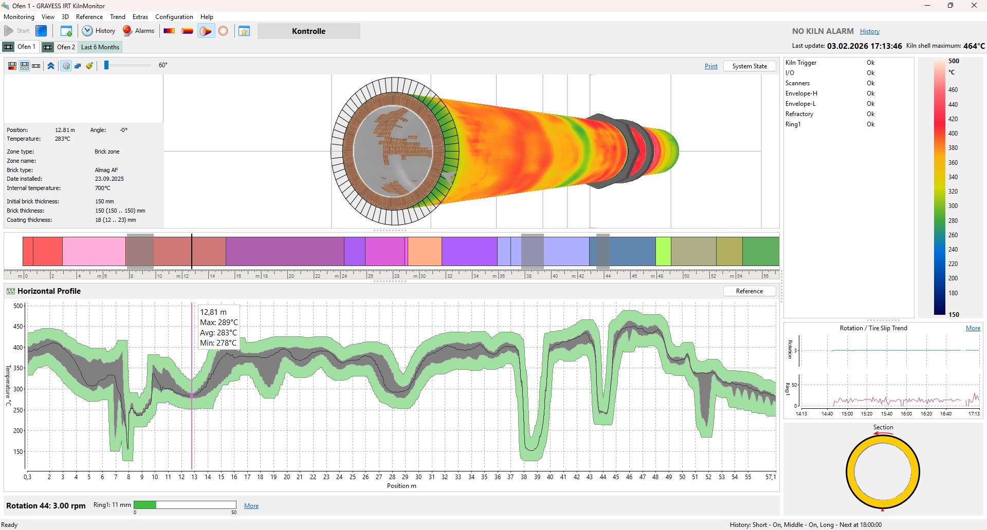 Das System nutzt aktuelle Ofenmantel-Temperaturen und vergleicht diese mit historischen Daten aus der integrierten Datenbank (Brick-Management). Anhand dieser Daten berechnet die Software tendenziell die verbleibende Dicke der Ausmauerung sowie die Stärke von Ringansätzen.